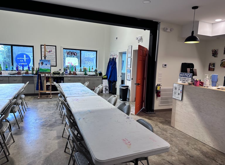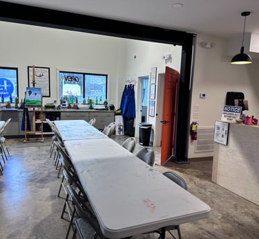 We offer a full Gallery, Paint/sip, Crafts, Private Lessons, Room Rental, Parties and community events!